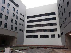 Uno de los proyectos de mayor complejidad en los que hemos trabajado a lo largo de nuestra historia, ha sido el que hemos llevado a cabo en el nuevo Hospital de Toledo. Se trata de un encargo exclusivamente de trabajos en fachadas sándwich in situ, así como chapa sobre la estructura portante. El montante resultante fueron 45000 m2 de fachada, con terminación en minionda.